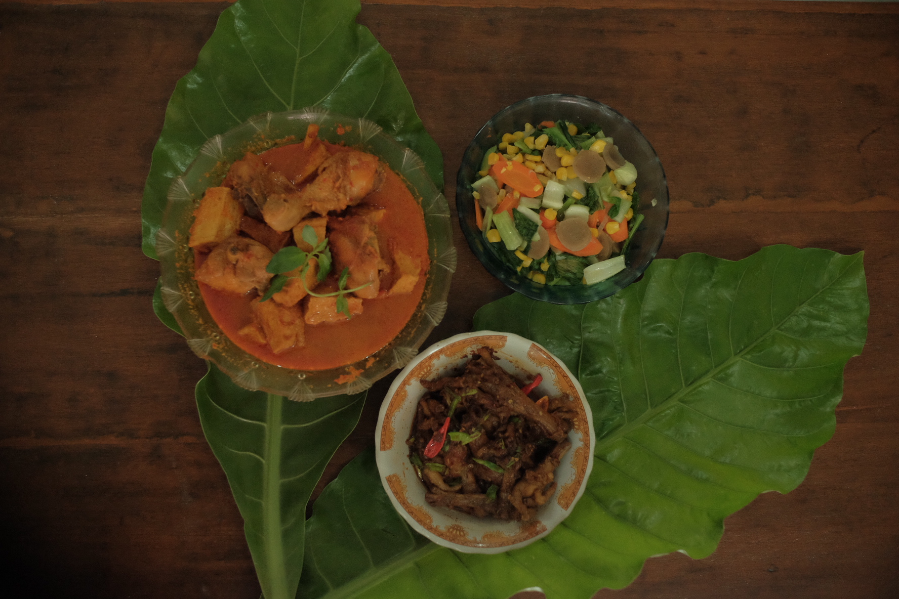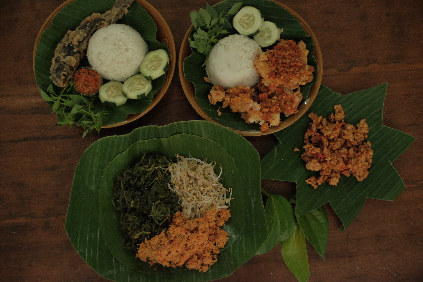 Ketan bubuk, Lele geprek, Ayam geprek, Nasi campur ayam, Nasi campur telur